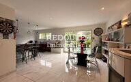 avec cuisine aménagée et équipée ouverte sur un bel espace de vie, poêle à granulés, arrière cuisine, salle d'eau, toilettes, garage.